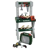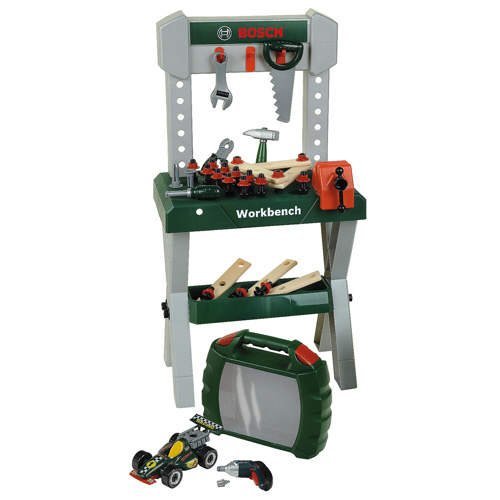 The Bosch Workbench Set from Klein offers a lot of play options. The set consists of a Bosch workbench with battery operated screwdriver (batt. not included), racing car set in case and many accessories like bench vice, saw, hammer, screw wrench, screws with nuts and many more! For ages 3 and up. The Bosch Workbench Set Toy with child-compatible functions For ages 3 and up Bosch Ixolino cordless driver drill with forward / reverse motion Racing car for children to assemble and dismantle Accessories with case Batteries required: 2 x AAA R03 size (not included) Height of the workbench: 35.6 inches Set includes: 1 workbench 1 bench vice 1 saw 6 timbers 1 hammer 1 screw wrench 1 screw driver 3 red hooks 2 nails; 22 screws with red nuts 1 pliers 1 Ixolino (blue) with 2 bits 1 green case 1 racing car Safety Warning: Chocking Hazard – Small parts. Not for children under 3 years.